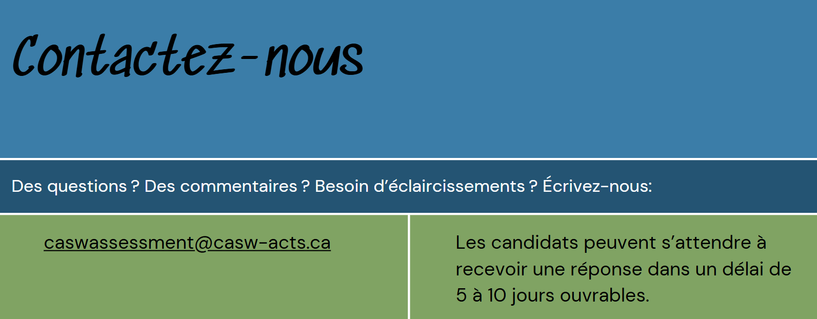 Un candidat ou une candidate peut demander une révision en soumettant une lettre au directeur général de l’ACTS. Vous devez indiquer la base de la révision et fournir des informations supplémentaires ou de nouvelles perspectives pour justifier la révision. Vous devez inclure tout document nécessaire à l’appui de votre demande. Les demandes de révision doivent être soumises par courriel à caswassessment@casw-acts.ca. La révision est soumise au directeur général de l’ACTS. Le directeur général de l’ACTS se réserve le droit de refuser la demande de révision si aucune nouvelle information ou explication substantielle n’est fournie pour justifier la révision. Si la révision est approuvée par le directeur général de l’ACTS, votre dossier sera réévalué par un autre évaluateur de l’ACTS en vue d’une révision indépendante. Les candidats et candidates seront informés de la réception de leur demande et de la décision du directeur général de l’ACTS de procéder ou non à l’examen.
